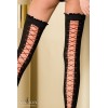 Paire de bas noirs opaques autofixants, décorés derrière d'un motif lacé rouge.