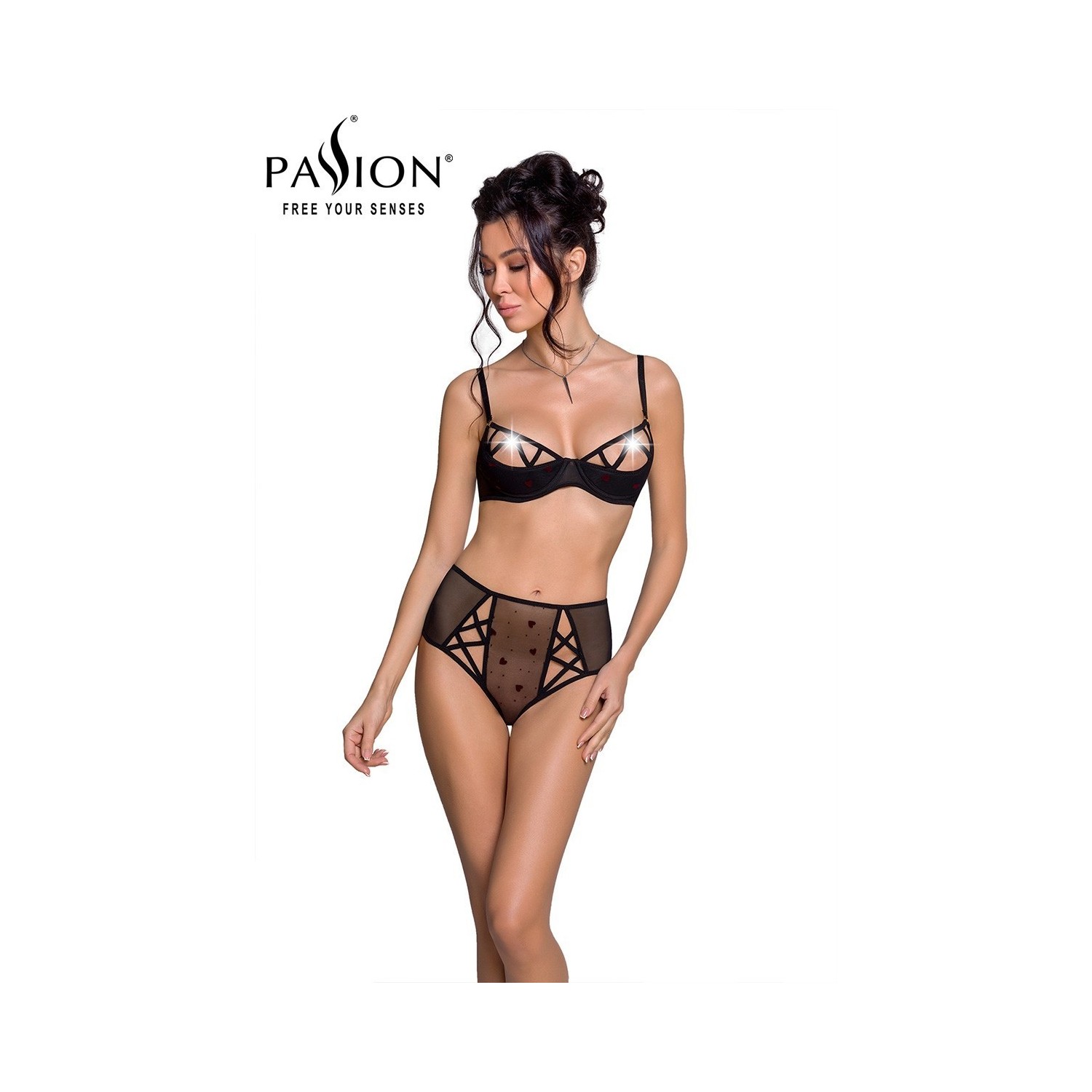 Bikini sexy en tulle noir floqué de coeurs rouge sombre, très coquin avec ses seins nus et sa culotte haute.